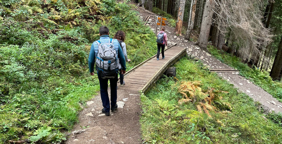 Dopo qualche minuto di cammino, incontrerai un grande ponte in legno e, una volta attraversato, si prosegue in mezzo al bosco, circondati dai panorami della Val di Rabbi.